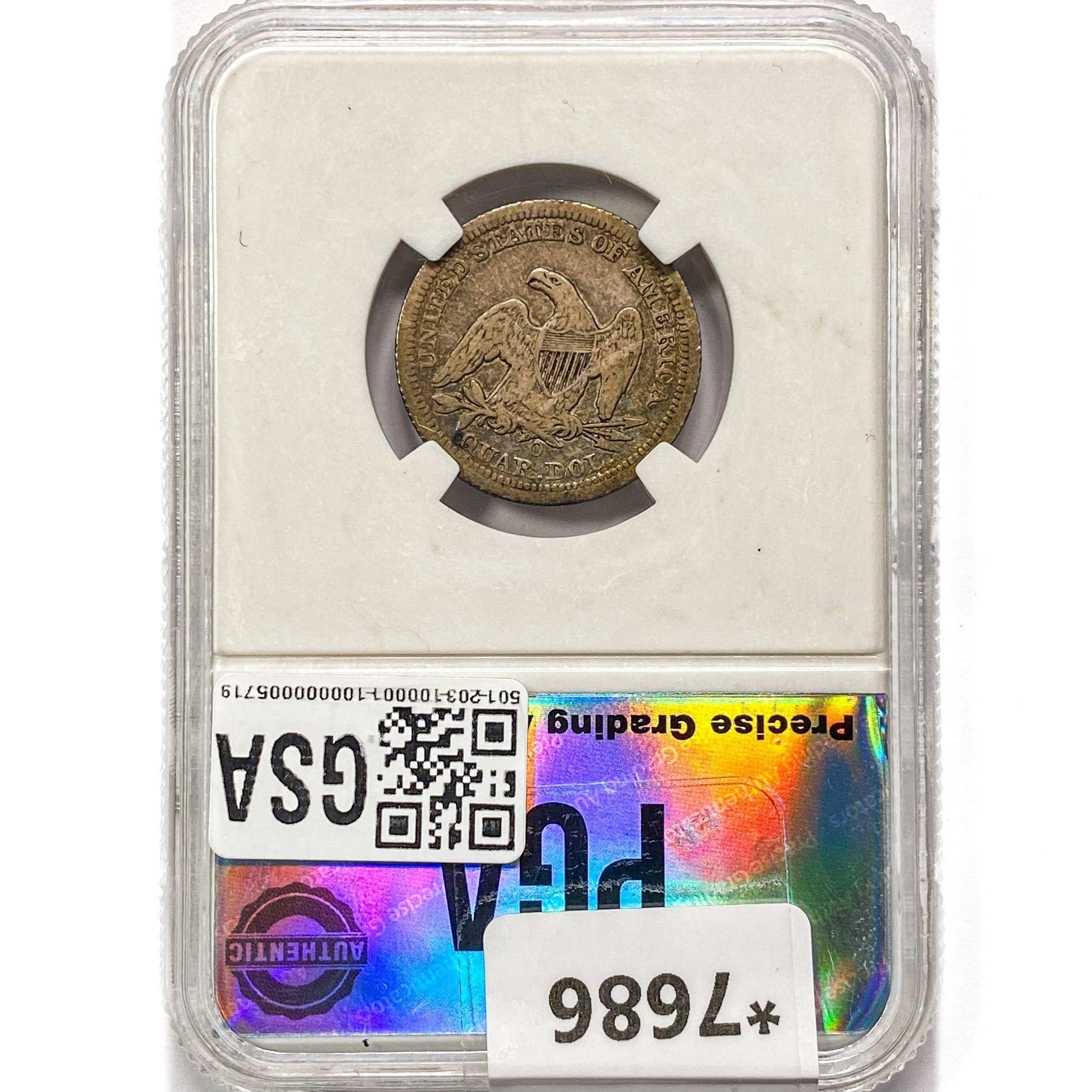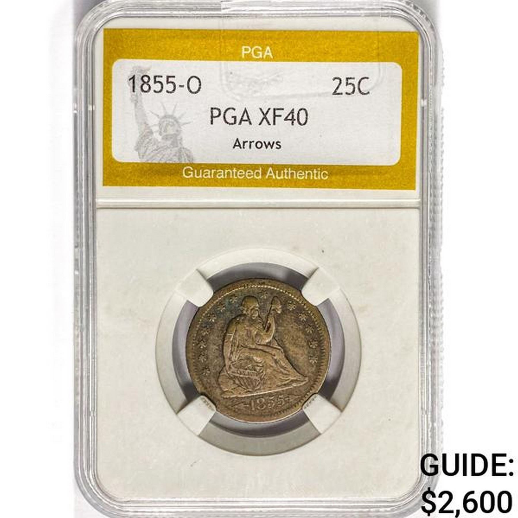 1855-O Seated Liberty Quarter PGA XF40 Arrows