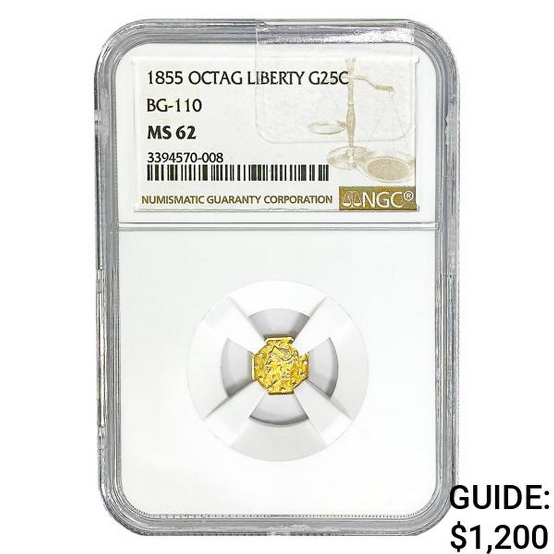 1855 Octagonal California Gold Quarter NGC MS62 BG