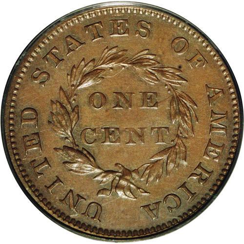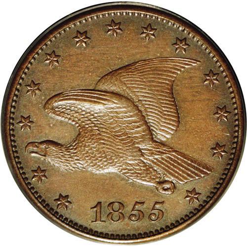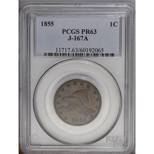 <B>1855 P1C Flying Eagle Cent, Judd-167A Original, Pollock-193, R.5, PR63 Brown PCGS.</B></I> A Flying Eagle cent pattern in a large format, featuring a hooked-neck eagle, slanting 5s on the obverse, and ONE CENT in the center of the reverse surrounded by a thick laurel wreath similar to that of a Large cent. Struck in copper with a plain edge (mis-attributed on the PCGS label as a unique nickel striking). Glossy medium brown surfaces display steel-blue peripheral accents on the obverse and retain glimmers of faded mint red color about the reverse devices.