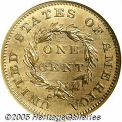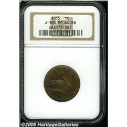<B>1855 P1C Flying Eagle Cent, Judd-168 Original, Pollock-193, R.4, PR65 Red and Brown NGC.</B></I> The design shows a large flying eagle surrounded by 13 stars on the obverse, while on the reverse ONE CENT is surrounded by a thick laurel wreath which is, in turn, surrounded by UNITED STATES OF AMERICA. Struck in copper or bronze with a plain edge. Very scarce with any of the original red color remaining, this piece shows a significant amount around the outer margins with honey-tan surfaces otherwise and nice reflectivity in the fields. Identifiable by some horizontal planchet streakiness on the reverse.