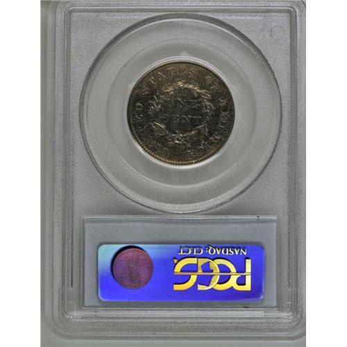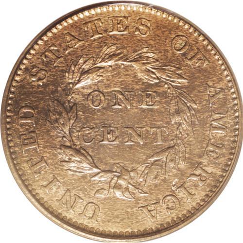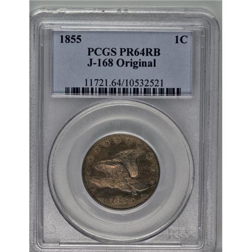 <B>1855<P1C> Flying Eagle Cent, Judd-168 Original, Pollock-193, R.4, PR64 Red and Brown PCGS.</B></I> An eagle flies level on the obverse, sharing elements of both the Titian Peale/Christian Gobrecht designs for the Gobrecht dollar reverses and the Flying Eagle cent obverse, and yet considerably less effective in execution than either of those successes. This issue is struck in bronze with a plain edge and is slightly smaller than a large cent, as part of the continuing series of experiments to reduce the size of the then-current old coppers. Thirteen stars surround the eagle. The reverse is similar to the large cent reverse, with a smaller wreath around the denomination. Some light clash marks are seen on each side. Much original red, a bit more than half, still clings to the attractive surfaces. Population: 14 in 64, 2 finer (7/06).