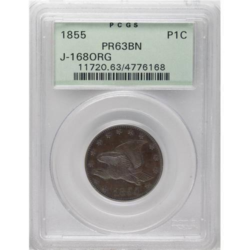 <B>1855 P1C Flying Eagle Cent, Judd-168 Original, Pollock-193, R.4, PR63 Brown PCGS.</B></I> The obverse shows a hook-neck eagle surrounded by thirteen stars with the date below. The reverse is similar in design to the Large Cent, but the wreath is smaller. Struck in copper or bronze with a plain edge. Pleasing medium brown surfaces with pale blue toning and hints of reflectivity.<BR><BR><b>Shipping:</b> Coin/Currency (<a target="_blank" href="http://www.heritageauctions.com/common/shipping.php">view shipping information</a>)