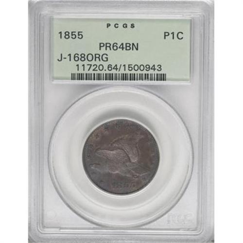 <B>1855 P1C Flying Eagle Cent, Judd-168 Original, Pollock-193, R.4, PR64 Brown PCGS.</B></I> The obverse shows a hook-neck eagle surrounded by thirteen stars with the date below. The reverse is similar in design to the Large Cent, but the wreath is smaller. Struck from clashed dies in bronze with a plain edge. Traces of mint red outline peripheral elements, but the fields and devices are toned mahogany-brown. Nicely struck aside from minor weakness on the right-side stars. A shallow strike-through is noted between stars 8 and 9. Housed in a green label holder. Population: 32 in 64, 3 finer (11/07).<BR><I>From The Madison Collection.</B></I><BR><BR><b>Shipping:</b> Coins & Currency (<a target="_blank" href="http://www.heritageauctions.com/common/shipping.php">view shipping information</a>)