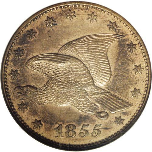 <B>1855<P1C> Flying Eagle Cent, Judd-168, Pollock-193, R.4, MS61 Brown NGC.</B></I> Similar to the 1854 Judd-165b pattern, which also features a hooked-neck eagle and stars on the obverse. The reverse has four leaves on the wreath below the E in CENT, unlike the closely designed Judd-172 and Judd-173. Struck in bronze with a plain edge. Although designated as a business strike by NGC, the fields are mildly prooflike. This piece features variegated plum-gray and apricot-gold toning, and has a few light obverse hairlines. Sharply struck from moderately clashed dies.