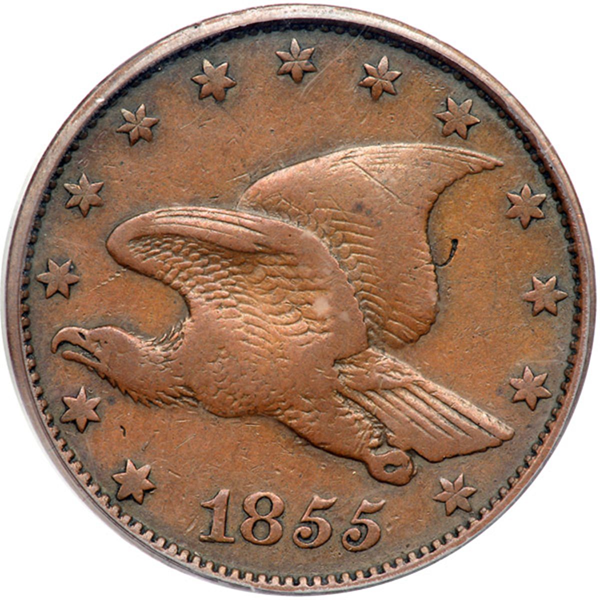 1855 Pattern Cent. Copper, plain edge. Original. PCGS graded Proof 40, Original. CAC approved. Pop 2; 21 finer (PCGS # 11709) .