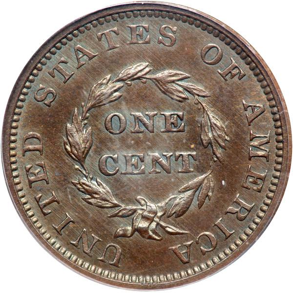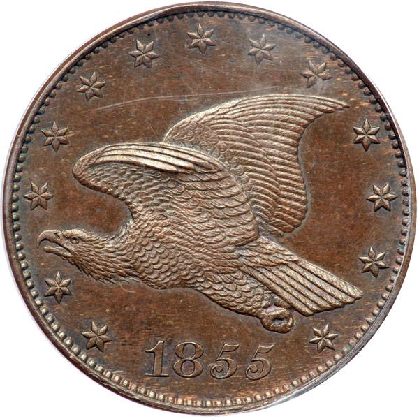 1855 Pattern Cent. Bronze, plain edge. Judd-173. Pollock-198 Low Rarity 7. PCGS graded Proof 64 Brown. Accompanied by an Eagle Eye certificate. A nicely struck pattern. The surfaces have the warm reddish brown coppery look that one would expect from this alloy with none of the often-seen spots. As with other known examples of Judd-173, the striking details tend to be very strong rather than weak; suggesting that this piece was struck with the correct die pressure intended to bring forth the details. The fields are very lightly hairlined and evidence of a Proof finish is present on each side. Pop 2; 1 finer in 65BN (PCGS # 11748) .