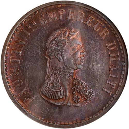 Faustin-Élie Soulouque (1782? - August 6, 1867) was a career officer and general in the Haitian army. He was made President of Haiti on March 1, 1847. In 1849 he had himself proclaimed Emperor of Haiti under the name of Faustin I. He was forced to abdicate by revolutionaries on January 15, 1859. Just another forgotten name (except by adoring numismatists) in an endless line of potentates.