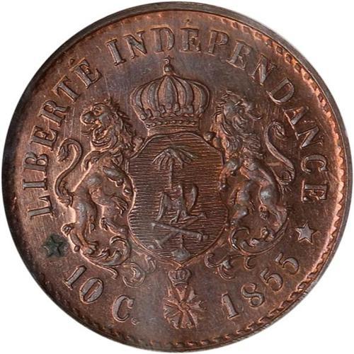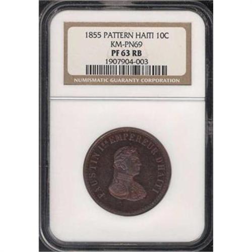 <b>1855. Pattern Haiti 10C. KM-PN69. NGC graded PF63 RB.</b> Red, brown, purple, and blue, with iridescence to spare, a very choice example of this design depicting Faustin as the First Emperor of Haiti. Frosted relief against a nice mirror finish. A little hubris goes a long way with politicians, since Faustin's empire extended over a small island in the Caribbean Ocean just south of Cuba.