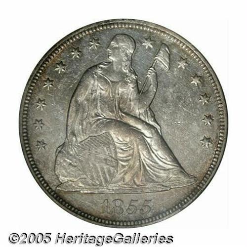 <B>1855<S$1> AU58 PCGS.</B></I> An above average strike with a trace of softness on some of the obverse stars. Modestly prooflike surfaces, and some luster, are evident beneath an overlay of dappled apricot, gold and gray toning, with normal marks for the grade and a few light rim bumps. Rare in all grades. Population: 15 in 58, 14 finer (5/05).