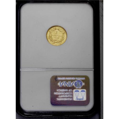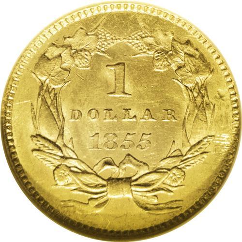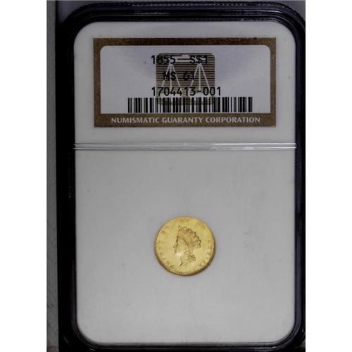 <B>1855<G$1> MS61 NGC.</B></I> NGC has mismarked the slab as a silver dollar. Bold clash marks from the reverse die show on the obverse periphery at AT in STATES. The obverse legend shows weakness, especially on some letter tops, and the reverse strike is weak through most of the digits in the date. Much luster is present, and the color is a pleasing canary-yellow. <BR><BR><B>Important notice:</B> Heritage usually auctions material at the rate of 200-250 lots per hour. On some occasions eBay Live bid software or the Internet may not be able to keep up with the pace of the auction. We recommend placing a realistic absentee bid now as insurance to avoid disappointment. Occasionally the auctioneer may eliminate or reject an eBay Live bid, and the auctioneer may also reopen a lot after the close of the eBay live bidding (usually because we missed an audience bid), and may reject your bid even if it shows you as the winning bidder. By bidding via eBay Live, you agree that Heritage may award the lot to another bidder at its sole discretion under the circumstances described above or any other reasonable circumstances. Since eBay bids are not shown to us until we open the lot on the floor, we treat those bids just like floor bids. In most cases the floor responds before the eBay bid is presented to us, due to Internet lag time, so for consistency we have made it a policy that floor bids are always considered first over tie eBay live bids. Also please note that all Heritage lots purchased through eBay Live carry a 20% Buyer's Premium. Please make sure you read the Terms and Conditions before you bid. This lot is being auctioned in conjunction with a live floor auction by Heritage Galleries & Auctioneers. All final auction and invoice information will be supplied by Heritage Galleries & Auctioneers, and all other information should be considered preliminary. Lot:2281 <BR><BR><B>Winning Notification and Billing:</B> After the FINAL session in this auction is complete, Heritage will send e-mail and snail mail invoices. This process normally takes several days. All final auction and invoice information will be supplied by Heritage Galleries & Auctioneers, and all other information should be considered preliminary. <BR><BR>This auction will be conducted on a live auction floor and over the Internet through eBay Live. If you choose to place an absentee bid, please take a moment to <font color='#0000ff'><u><a href='http://pages.ebay.com/liveauctions/help/before/laabsentee.html'>learn how eBay Live absentee bidding works</a></u></font><font color='#000000'>