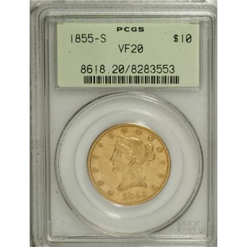<B>1855-S $10 VF20 PCGS.</B></I> The '54-S and '56-S are available by the standards of No Motto San Francisco eagles, but the '55-S is a rarity. Only 9,000 pieces were struck, since the Mint focused on double eagle production. Well defined for the VF20 grade, and luster remnants are present, particularly within the shield. Housed in an old green label holder. Population: 1 in 20, 47 finer (6/07).<BR><BR><b>Shipping:</b> Coins & Currency (<a target="_blank" href="http://www.heritageauctions.com/common/shipping.php">view shipping information</a>)