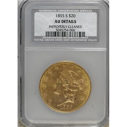 <B>1855-S $20 --Improperly Cleaned--NCS. AU Details.</B></I> NGC Census: (85/432). PCGS Population (77/144). Mintage: 879,675. Numismedia Wsl. Price for NGC/PCGS coin in AU50: $1,250. (#8916)<BR><BR><B>Coin Engraver:</B> James B. Longacre<BR><BR><b>Shipping:</b> Coins & Currency (<a target="_blank" href="http://www.heritageauctions.com/common/shipping.php">view shipping information</a>)