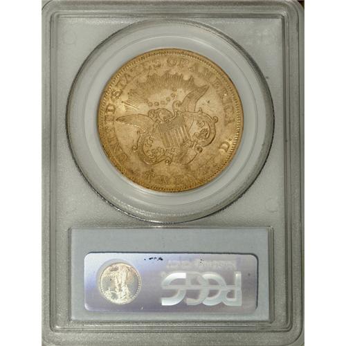 <B>1855-S $20 AU53 PCGS.</B></I> Although both sides have myriad surface marks, the light yellow-gold luster, reflective fields, and faint lilac toning enhance the presentation. While several pieces were found among the <I>S.S. Central America</B></I> treasure, this date remains quite scarce.<BR><BR><b>Shipping:</b> Coins & Currency (<a target="_blank" href="http://www.heritageauctions.com/common/shipping.php">view shipping information</a>)