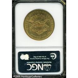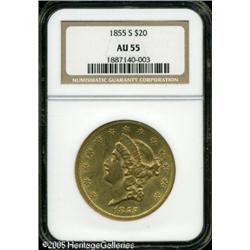 <B>1855-S $20 AU55 NGC.</B></I> A scarcer Type One S-mint twenty and generally not found any finer than this example. Numerous small to medium sized abrasions are peppered over each side of this well struck coin. Lot:8952