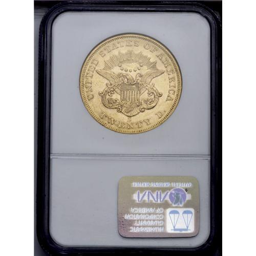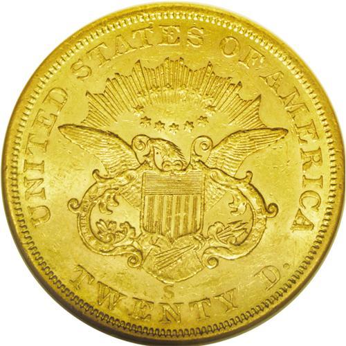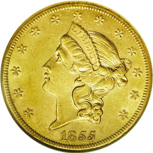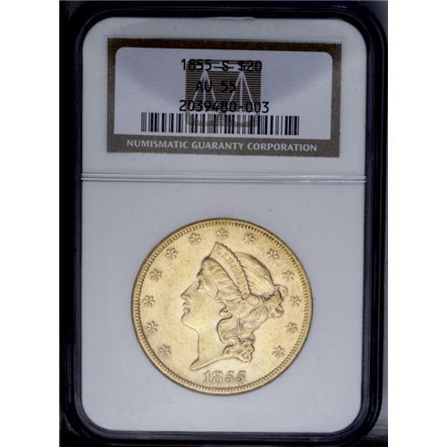 <B>1855-S<$20> AU55 NGC.</B></I> Due to treasure discoveries over the past few years, the '55-S double eagle has "become" a common date, although it is still elusive and desirable in higher grades. This example has typical surfaces with myriad abrasions, but none that are individually significant. It is highly lustrous with brilliant yellow-gold surfaces and a trace of pink toning hidden in the devices. The design motifs are sharply defined, as always for this issue. It has been described as one of the best produced Type One double eagles. When Bob Evans, Chief Scientist of the <I>S.S. Central America</B></I> project, studied the double eagles recovered from that treasure, he identified eight different reverse varieties for the 1855-S issue. This particular example has a Broken A in STATES, and an S mintmark that tilts slightly to the left. It is probably the case that this example pre-dates the treasure recovery.<BR><I>From The Wyoming Collection.</B></I>