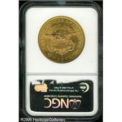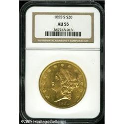 <B>1855-S $20 AU55 NGC.</B></I> Pleasingly preserved with an apparent die chip over the second five in the date that prevents much of the detail from being shown. Bright yellow-gold color helps to increase the eye appeal on the piece.<BR><I>From The Richard J. Chouinard Collection of United States Coins, Part Two.</B></I> Lot:8954