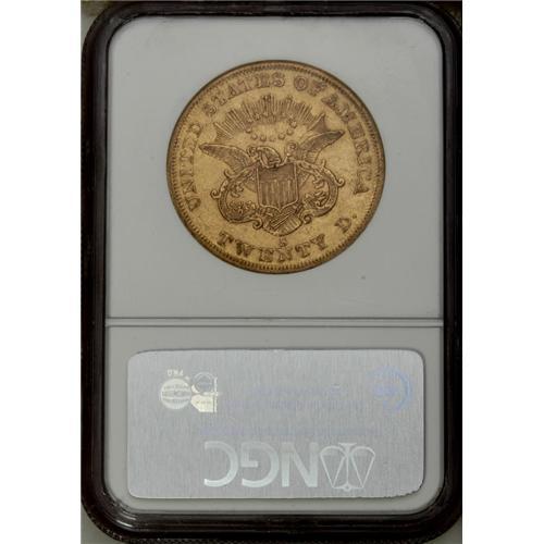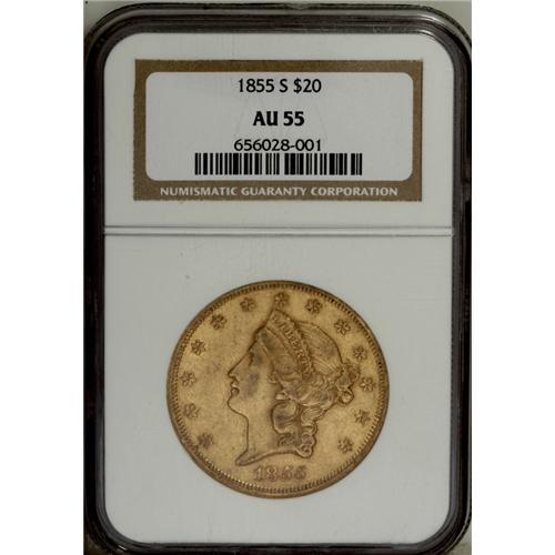 <B>1855-S $20 AU55 NGC.</B></I> This well struck double eagle, which hails from the second year of the San Francisco Mint, retains a degree of soft luster. The yellow-orange surfaces show a number of handling marks.<BR><BR><b>Shipping:</b> Coins & Currency (<a target="_blank" href="http://www.heritageauctions.com/common/shipping.php">view shipping information</a>)