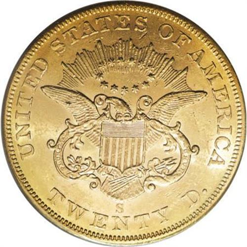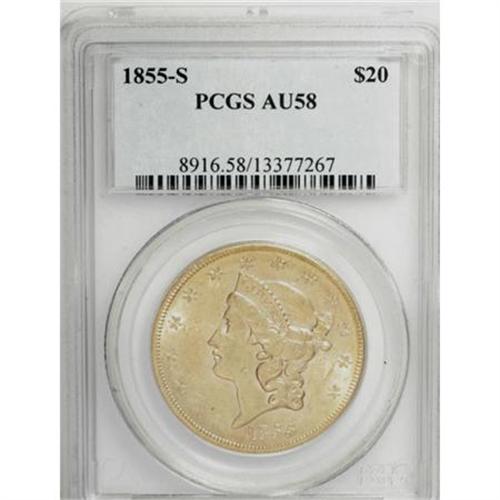 <B>1855-S $20 AU58 PCGS.</B></I> A nicely struck example with no individually heavy marks. The reverse has essentially complete luster, while the obverse luster is subdued only on the cheek. Shipwreck recoveries have made the '55-S more available at the Borderline Uncirculated level, but demand has kept up with the supply.<BR><BR><B>Coin Engraver:</B> James B. Longacre<BR><BR><b>Shipping:</b> Coins & Currency (<a target="_blank" href="http://www.heritageauctions.com/common/shipping.php">view shipping information</a>)