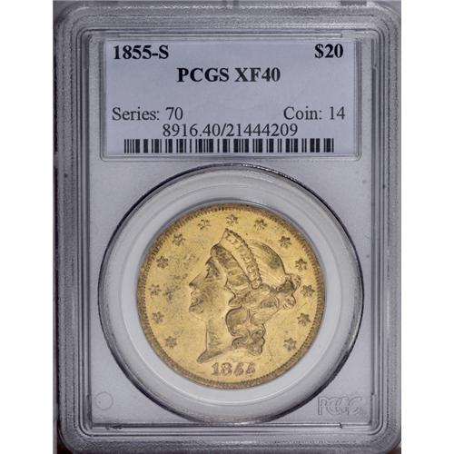 1855-S $20 XF40 NGC. Both sides are bathed in apricot- 1855-S[$20] XF40 NGC.