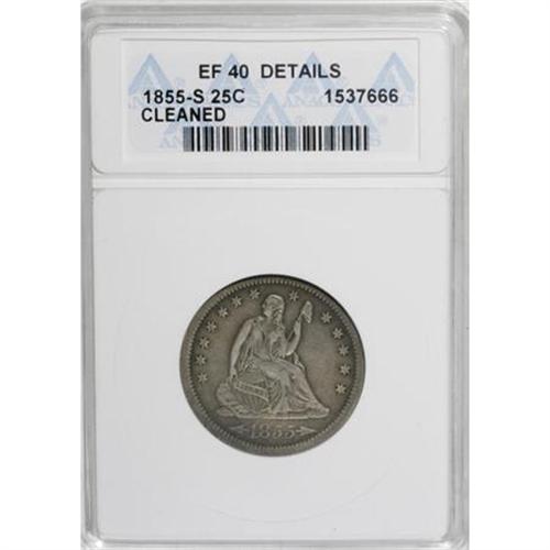 <B>1855-S 25C Arrows--Cleaned--ANACS. XF40 Details.</B></I> NGC Census: (0/16). PCGS Population (2/24). Mintage: 396,400. Numismedia Wsl. Price for NGC/PCGS coin in XF40: $400. (#5437)<BR><BR><B>Coin Engraver:</B> Christian Gobrecht<BR><BR><b>Shipping:</b> Coins & Currency (<a target="_blank" href="http://www.heritageauctions.com/common/shipping.php">view shipping information</a>\)