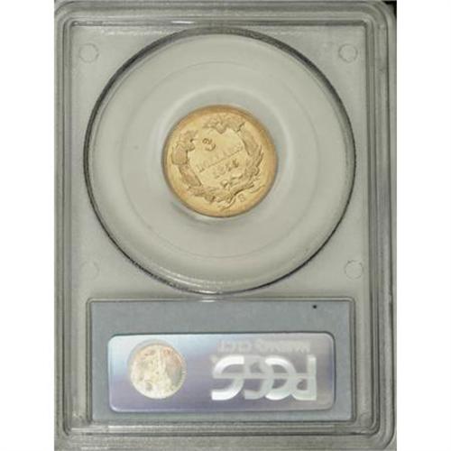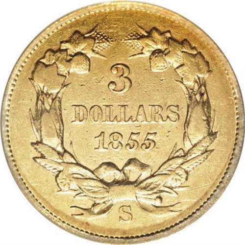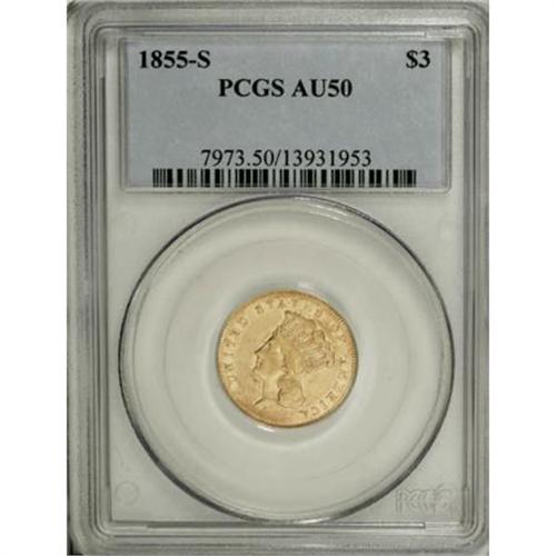 <B>1855-S $3 AU50 PCGS.</B></I> Luster brightens the legends and device outlines. The portrait and wreath show only moderate wear. Marks are minimal for the grade. Just 6,600 pieces were struck, and since there were no West Coast collectors in 1855, examples survived only by chance. Population: 8 in 50, 17 finer (11/07).<BR><BR><B>Coin Engraver:</B> James B. Longacre<BR><BR><b>Shipping:</b> Coins & Currency (<a target="_blank" href="http://www.heritageauctions.com/common/shipping.php">view shipping information</a>)