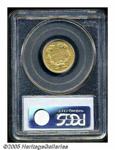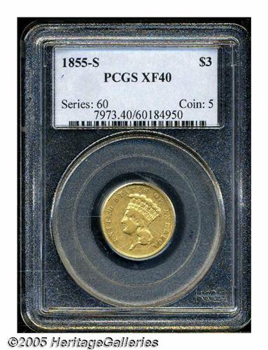 <B>1855-S<$3> XF40 PCGS.</B></I> Faintly-orange golden color, even wear across the high points, and a pin scratch noted for accuracy across Liberty's ear.