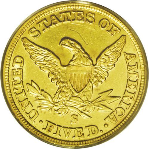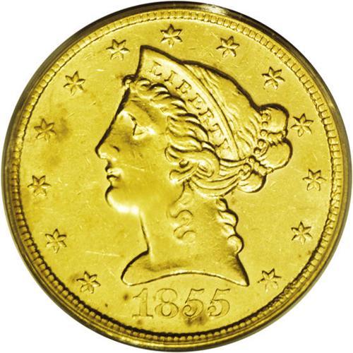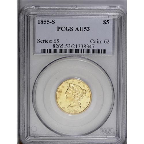 1855-S $5 AU53 PCGS. Usually found in lower grades, th