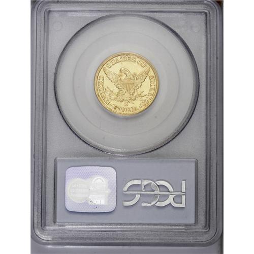 <B>1855-S<$5> AU53 PCGS.</B></I> Usually found in lower grades, this is an important issue as the first truly collectible San Francisco Mint half eagle. This example boasts bright but natural canary-yellow surfaces (the slab is badly scratched near Liberty's lower jaw, (which shows in the photo) with ample mint luster and a single dark spot near star 4. A scrape above the eagle's head is mentioned for accuracy. An attractive example of this historic issue. Population: 13 in 53, 27 finer (7/06).