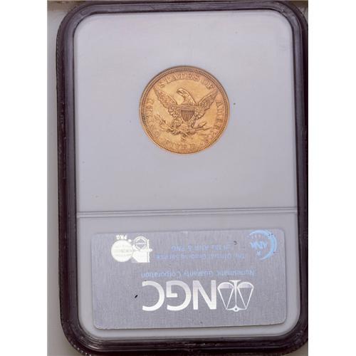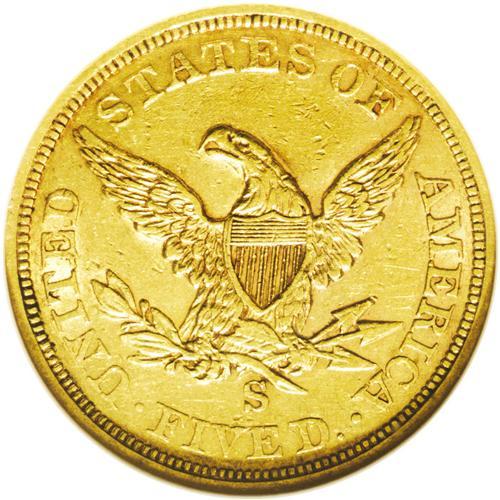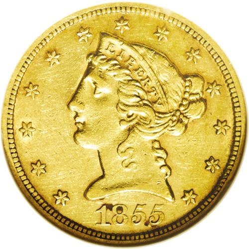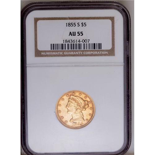 <B>1855-S<$5> AU55 NGC.</B></I> The first collectible year of half eagle production at the San Francisco Mint (the 1854-S being prohibitively rare) and a conditionally scarce issue from a mintage of 61,000 pieces. This desirable example is well struck and retains liberal amounts of luster in the recesses. Areas of encrustation about the date appear to be nothing more than dark verdigris. Census: 26 in 55, 20 finer (7/06).