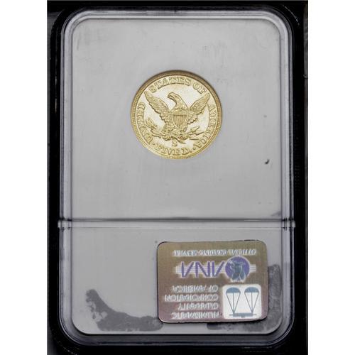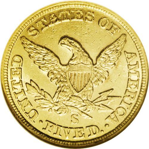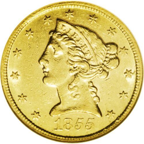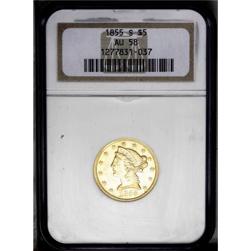 <B>1855-S<$5> AU58 NGC.</B></I> This date is virtually impossible to find in uncirculated grades, with a total of four examples certified as such. Therefore, most collectors try to obtain an example in this grade or close to it. The present coin boasts a sharp strike and decent eye appeal. The surfaces show scattered handling marks, mostly in the fields, but they blend well into the coin. Stylistically important are the slanting 5s and the huge S mintmark, both historic reminders of that bygone era. <BR><BR><B>Important notice:</B> Heritage usually auctions material at the rate of 200-250 lots per hour. On some occasions eBay Live bid software or the Internet may not be able to keep up with the pace of the auction. We recommend placing a realistic absentee bid now as insurance to avoid disappointment. Occasionally the auctioneer may eliminate or reject an eBay Live bid, and the auctioneer may also reopen a lot after the close of the eBay live bidding (usually because we missed an audience bid), and may reject your bid even if it shows you as the winning bidder. By bidding via eBay Live, you agree that Heritage may award the lot to another bidder at its sole discretion under the circumstances described above or any other reasonable circumstances. Since eBay bids are not shown to us until we open the lot on the floor, we treat those bids just like floor bids. In most cases the floor responds before the eBay bid is presented to us, due to Internet lag time, so for consistency we have made it a policy that floor bids are always considered first over tie eBay live bids. Also please note that all Heritage lots purchased through eBay Live carry a 20% Buyer's Premium. Please make sure you read the Terms and Conditions before you bid. This lot is being auctioned in conjunction with a live floor auction by Heritage Galleries & Auctioneers. All final auction and invoice information will be supplied by Heritage Galleries & Auctioneers, and all other information should be considered preliminary. Lot:2732 <BR><BR><B>Winning Notification and Billing:</B> After the FINAL session in this auction is complete, Heritage will send e-mail and snail mail invoices. This process normally takes several days. All final auction and invoice information will be supplied by Heritage Galleries & Auctioneers, and all other information should be considered preliminary. <BR><BR>This auction will be conducted on a live auction floor and over the Internet through eBay Live. If you choose to place an absentee bid, please take a moment to <font color='#0000ff'><u><a href='http://pages.ebay.com/liveauctions/help/before/laabsentee.html'>learn how eBay Live absentee bidding works</a></u></font><font color='#000000'>