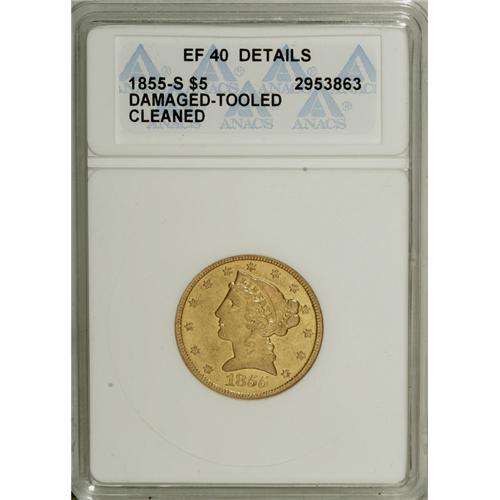 1855-S $5 --Cleaned, Damaged, Tooled--ANACS. XF40 Det