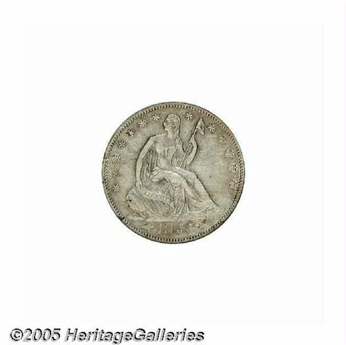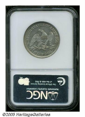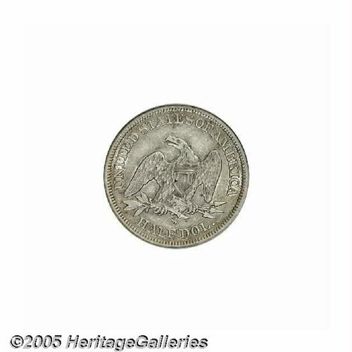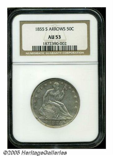 <B>1855-S<50C> Arrows AU53 NGC.</B></I> The 1855-S half dollar, first of its kind from the San Francisco Mint, is elusive in all grades. Perhaps much of the mintage was melted, because it is clearly scarcer than the 1856-S and 1857-S, which have higher but similar productions. The only Arrows No Motto S-mint issue, it is necessary to a San Francisco type set. The surfaces are light gray with some remaining luster. All design details are boldly rendered. An interesting die break (as made) is above Liberty's shield. A few small marks are visible, including a small arrowhead shaped mark in the shield. Population: 2 in 53, 14 finer (6/05).