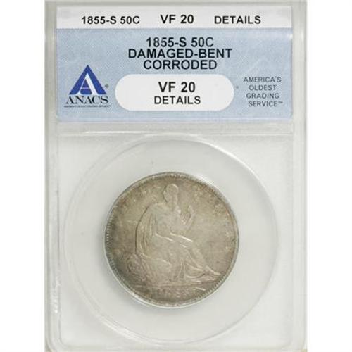 <B>1855-S 50C Arrows--Damaged, Bent, Corroded--ANACS. VF20 Details.</B></I> Elements of violet and rose-orange at the margins surround silver-gray centers. Light corrosion over moderate wear, pockmarks in the reverse fields, a number of rim nicks, and a slight bend combine for the mouthful of qualifiers on this details-graded piece, a coin that, for all its flaws, retains a measure of visual appeal.<BR><BR><B>Coin Engraver:</B> Christian Gobrecht<BR><BR><b>Shipping:</b> Coins & Currency (<a target="_blank" href="http://www.heritageauctions.com/common/shipping.php">view shipping information</a>)