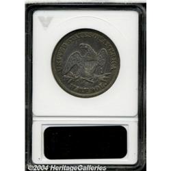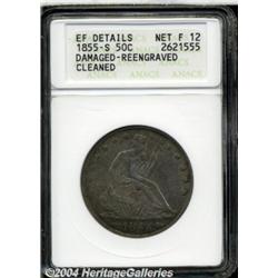 <B>1855-S<50C> Arrows--Damaged, Reengraved, Cleaned--ANACS. XF Details, Net Fine 12.</B></I> Reengraving is evident on both sides, as is damage on Liberty's upper torso and on the lower portion of the eagle. A few scattered light ticks and hairline patches can be seen beneath the bluish-gray toning.<BR><I>From The Professor Wayne Newman Palmer Collection, Part One.</B></I> <BR><BR><B>Important notice:</B> Heritage usually auctions material at the rate of 200-250 lots per hour. On some occasions eBay Live bid software or the Internet may not be able to keep up with the pace of the auction. We recommend placing a realistic absentee bid now as insurance to avoid disappointment. Occasionally the auctioneer may eliminate or reject an eBay Live bid, and the auctioneer may also reopen a lot after the close of the eBay live bidding (usually because we missed an audience bid), and may reject your bid even if it shows you as the winning bidder. By bidding via eBay Live, you agree that Heritage may award the lot to another bidder at its sole discretion under the circumstances described above or any other reasonable circumstances. Since eBay bids are not shown to us until we open the lot on the floor, we treat those bids just like floor bids. In most cases the floor responds before the eBay bid is presented to us, due to Internet lag time, so for consistency we have made it a policy that floor bids are always considered first over tie eBay live bids. Also please note that all Heritage lots purchased through eBay Live carry a 20% Buyer's Premium. Please make sure you read the Terms and Conditions before you bid. </span></font></tr></table></td></tr></table>