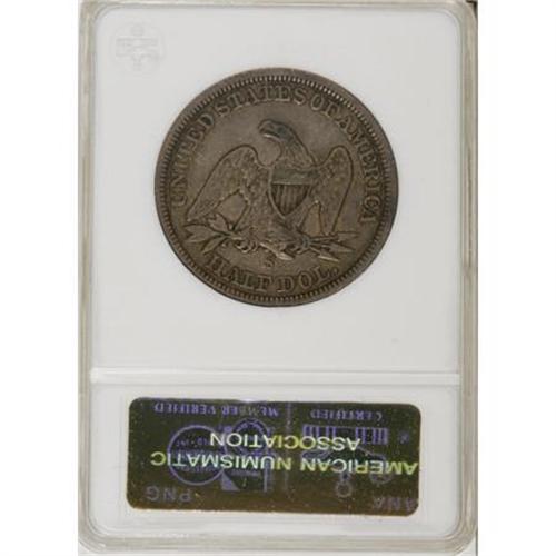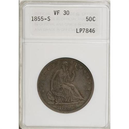 <B>1855-S 50C Arrows VF30 ANACS.</B></I> This elusive S-mint Arrows half retains excellent detail despite moderate wear. The steel-blue and olive surfaces show a number of fine abrasions that contribute to the grade. Housed in a pre-Amos Press ANACS holder.<BR><BR><B>Coin Engraver:</B> Christian Gobrecht<BR><BR><b>Shipping:</b> Coins & Currency (<a target="_blank" href="http://www.heritageauctions.com/common/shipping.php">view shipping information</a>)