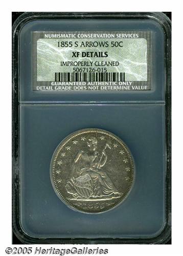 <B>1855-S<50C> Arrows XF Details, Improperly Cleaned, NCS.</B></I> WB-101. Large Mintmark. The 1855-S Half Dollar is one of the scarcest and most respected issues in the entire Seated Half series, being even more challenging than its relatively modest mintage of 129,950 pieces would suggest. Both sides of this bright silver-gray example exhibit balanced wear but evidence of cleaning is blatantly present.<BR><I>From The Empire State Collection.</B></I>