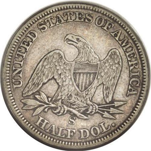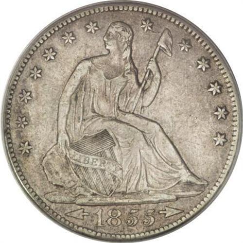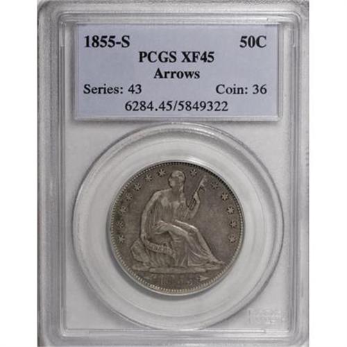 <B>1855-S 50C Arrows XF45 PCGS.</B></I> In its first year of operation, the San Francisco Mint struck only gold coins, despite the compelling need for smaller denominations in the cash-starved Gold Rush economy. Although nearly 130,000 half dollars were struck in 1855, all went immediately into commerce. PCGS has certified only a single example as Mint State. The 1855-S is also the sole Arrows, No motto issue from the Western facility. This is a pleasing cream-gray example with a full, sharp LIBERTY and an unblemished appearance. Population: 7 in 45, 9 finer (2/08).<BR><I>From The Yoder Family Collection, Part One.</B></I><BR><BR><B>Coin Engraver:</B> Christian Gobrecht<BR><BR><b>Shipping:</b> Coins & Currency (<a target="_blank" href="http://www.heritageauctions.com/common/shipping.php">view shipping information</a>)