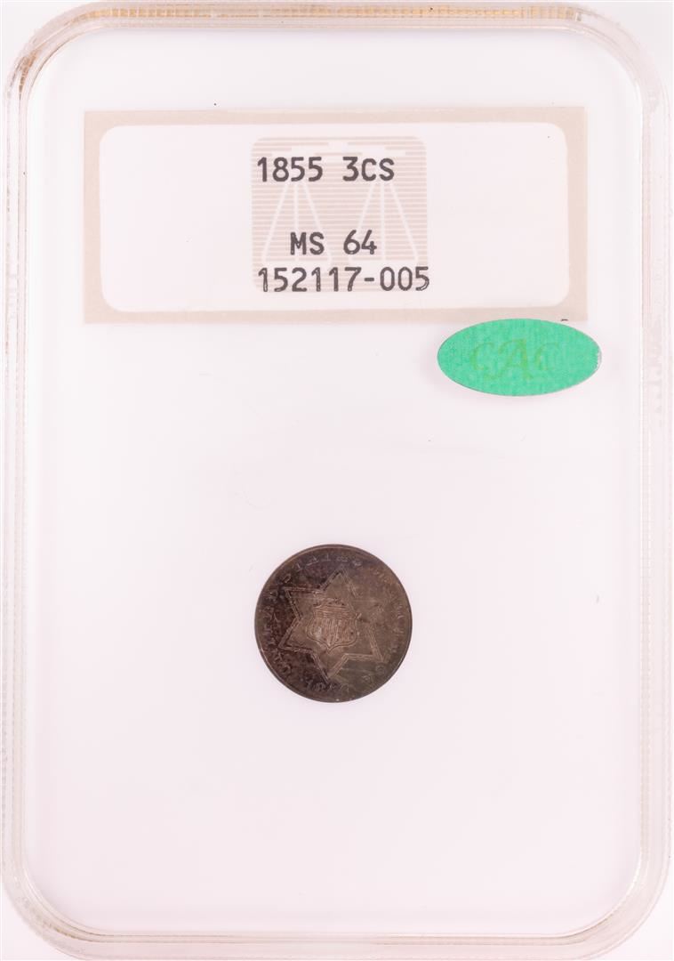 One 1855 Three Cent Silver Coin NGC MS64 CAC. NGC Certified.