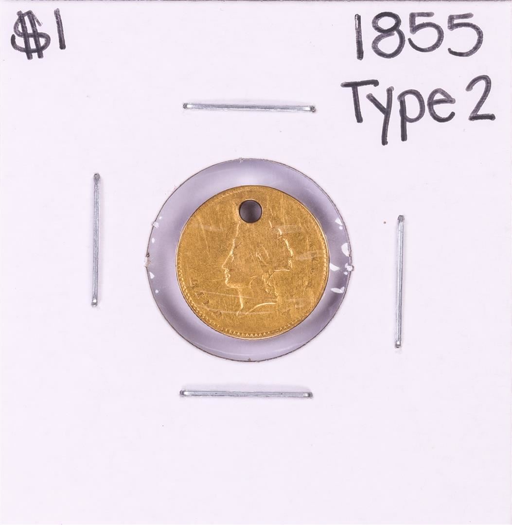 1855 Type 2 $1 Indian Princess Head Gold Dollar Coin with Hole