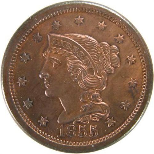 1855 Upright 55, Very Choice Red and Brown Uncirculated. Over 50% red