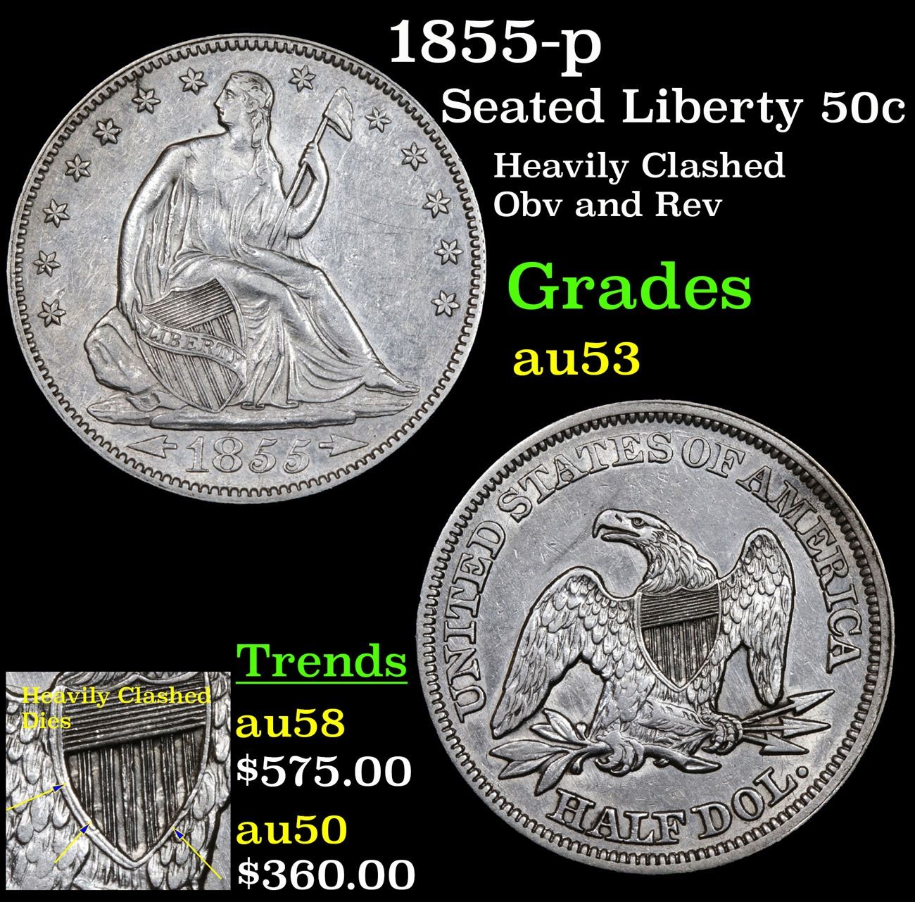 1855-p Heavily Clashed Obv and Rev . Seated Half Dollar 50c Grades Select AU.