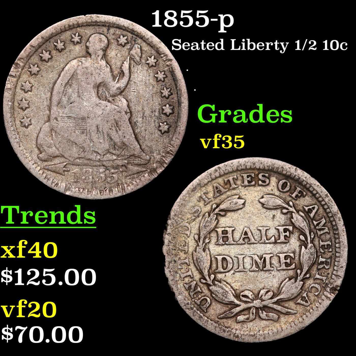 1855-p Seated Liberty Half Dime 1/2 10c Grades vf++.