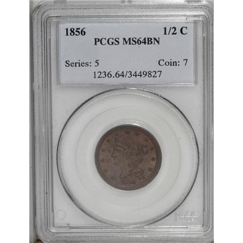 1856 1/2 C MS64 Brown PCGS. C-1, B-1, R.1. Generally w