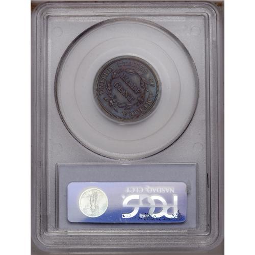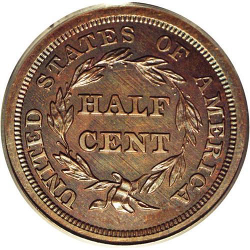 <B>1856<1/2 C> PR65 Brown PCGS.</B></I> B-3, R.4. The T in CENT is doubled, diagnostic for Breen-3. According to Breen's <I>Encyclopedia of United States Half Cents,</B></I> 200 proofs were struck on June 18, during the waning days of the half cent denomination. The present razor-sharp Gem is beautifully patinated electric-blue, with ruby-red blushes near the stars and legends. Faint parallel striations on the reverse field are as made. EAC PR60.