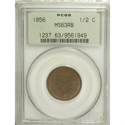 <B>1856 1/2 C MS63 Red and Brown PCGS.</B></I> PCGS Population (20/27). NGC Census: (12/23). Mintage: 40,430. Numismedia Wsl. Price for NGC/PCGS coin in MS63: $420. (#1237)<BR><BR><B>Coin Engraver:</B> Christian Gobrecht<BR><BR><b>Shipping:</b> Coins & Currency (<a target="_blank" href="http://www.heritageauctions.com/common/shipping.php">view shipping information</a>)