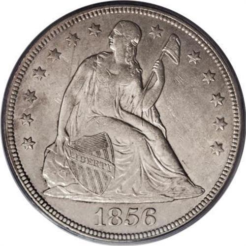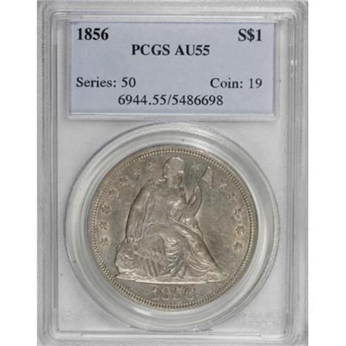<B>1856 $1 AU55 PCGS.</B></I> The 1856 dollar, from a mintage of 63,500 business strikes, is rare in all grades, as most were exported to China or Europe (David Bowers, 1993). Light champagne-gold patina resides on this Choice AU example. The design elements display better definition than usually seen on this typically weak issue, except for softness in the hair at Liberty's head and the feathers on the right (left facing) leg. A few light marks are inconsequential.<B><BR></B></I><I>From The Beau Clerc Collection.</B></I><BR><BR><B>Coin Engraver:</B> Christian Gobrecht<BR><BR><b>Shipping:</b> Coins & Currency (<a target="_blank" href="http://www.heritageauctions.com/common/shipping.php">view shipping information</a>)