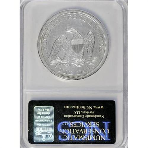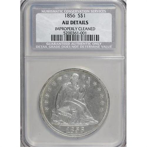<B>1856 $1 --Improperly Cleaned--NCS. AU Details.</B></I> This ivory-gray No Motto dollar is delicately hairlined and a bit subdued. No field marks merit individual description. A better date that is rarely encountered in Uncirculated grades.<BR><BR><B>Coin Engraver:</B> Christian Gobrecht<BR><BR><b>Shipping:</b> Coins & Currency (<a target="_blank" href="http://www.heritageauctions.com/common/shipping.php">view shipping information</a>)