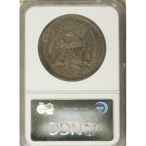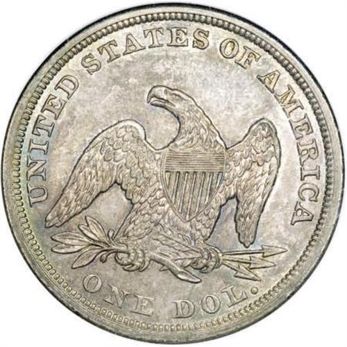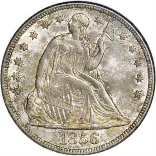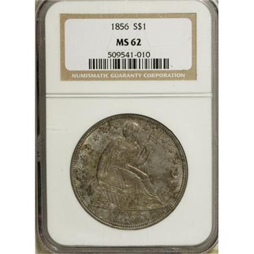 <B>1856 $1 MS62 NGC.</B></I> This issue is rare in all grades, as most of the 63,500-piece mintage was apparently exported. Splashes of low intensity orange-gold, sea-green, and aqua-blue patina race over the obverse, while slightly deeper hues of the same color scheme cover the reverse. A well directed strike results in better-than-average detail, except for minor softness in the upper right stars. A few minute obverse contact marks define the grade. Census: 5 in 62, 5 finer (2/08).<BR><I>From The Queller Family Collection of Silver Dollars.</B></I><BR><BR><B>Coin Engraver:</B> Christian Gobrecht<BR><BR><b>Shipping:</b> Coins & Currency (<a target="_blank" href="http://www.heritageauctions.com/common/shipping.php">view shipping information</a>)