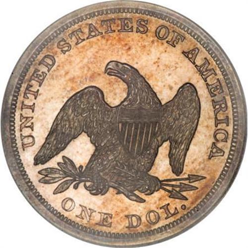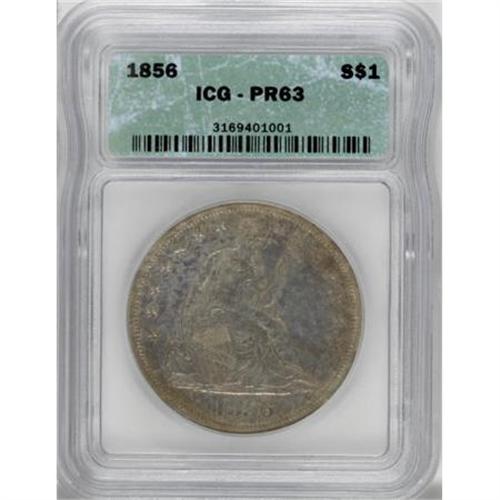 <B>1856 $1 PR63 ICG.</B></I> Bold definition and mottled gold toning greet the eye on this remarkable proof. Struck prior to the 1858 beginning of proof production intended for collectors, the mintage of similar pieces was undoubtedly small, often estimated at only 50 coins. Struck from an obverse die that is identified by the date position, slightly left of normal with the shield point centered over the upright of the 1. The reverse is the same die that appears on the 1856 and 1857 proof dollars in the Queller Family Collection.<BR><BR><B>Coin Engraver:</B> Christian Gobrecht<BR><BR><b>Shipping:</b> Coins & Currency (<a target="_blank" href="http://www.heritageauctions.com/common/shipping.php">view shipping information</a>)