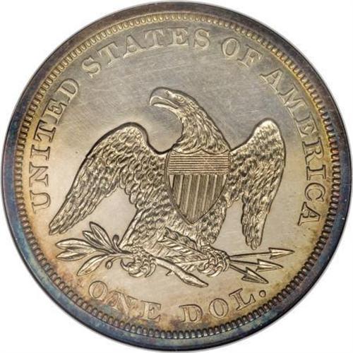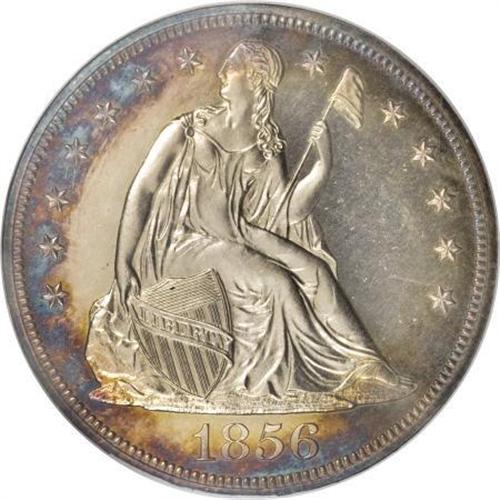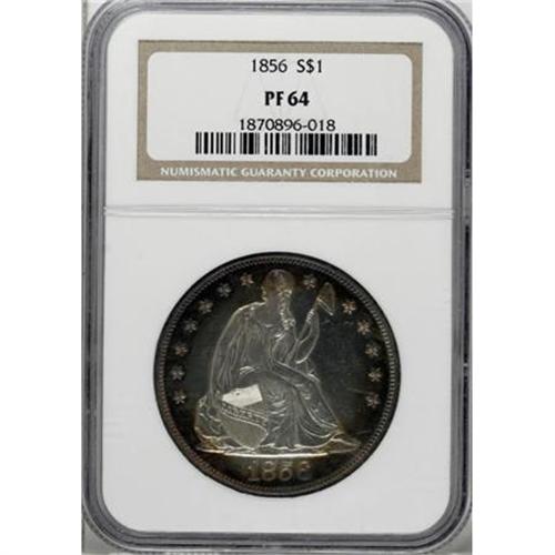 <B>1856 $1 PR64 NGC.</B></I> The 1856 and 1857 proofs in the Queller Collection share the same reverse die. Diagnostics include die rust on the left base of the L in DOL, and die lines above the IT in UNITED and between the TES in STATES. Die lines through ONE DOL are noticeable on the 1856, but are faded from the 1857. According to Bowers, this reverse die was also used for some 1858 proofs. The present specimen has beautiful peripheral electric-blue, fire-red, and golden-brown toning. The fields and devices are generally brilliant. The strike is penetrating, and the eye appeal is exceptional. Census: 16 in 64, 6 finer (2/08).<BR><I>Ex: Amon G. Carter, Jr. Collection (Stack's, 1/1984), lot 265.<BR>From The Queller Family Collection of Silver Dollars.</B></I><BR><BR><B>Coin Engraver:</B> Christian Gobrecht<BR><BR><b>Shipping:</b> Coins & Currency (<a target="_blank" href="http://www.heritageauctions.com/common/shipping.php">view shipping information</a>)